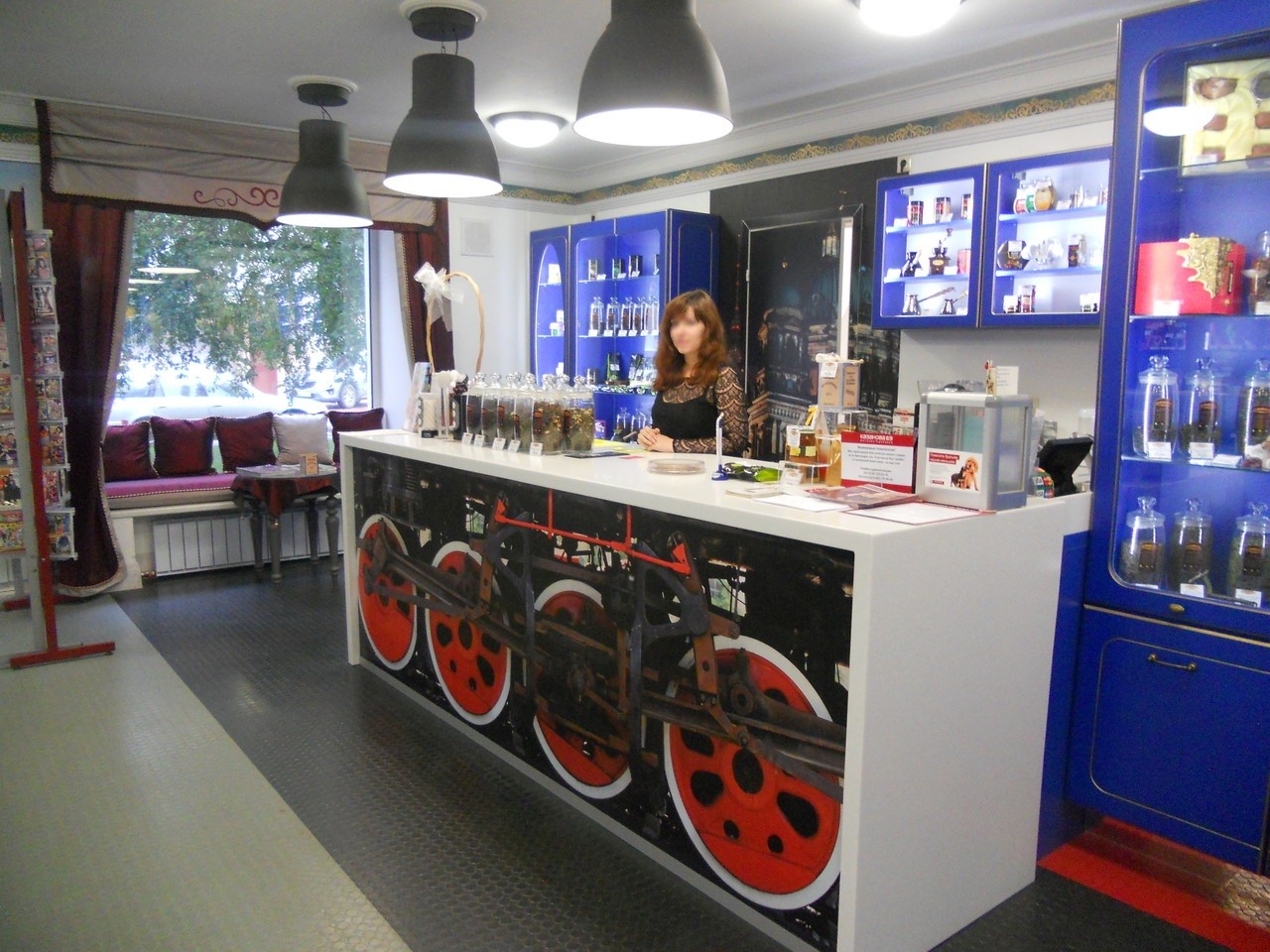 ロシア美女の後ろの棚にはたくさんの中国茶、